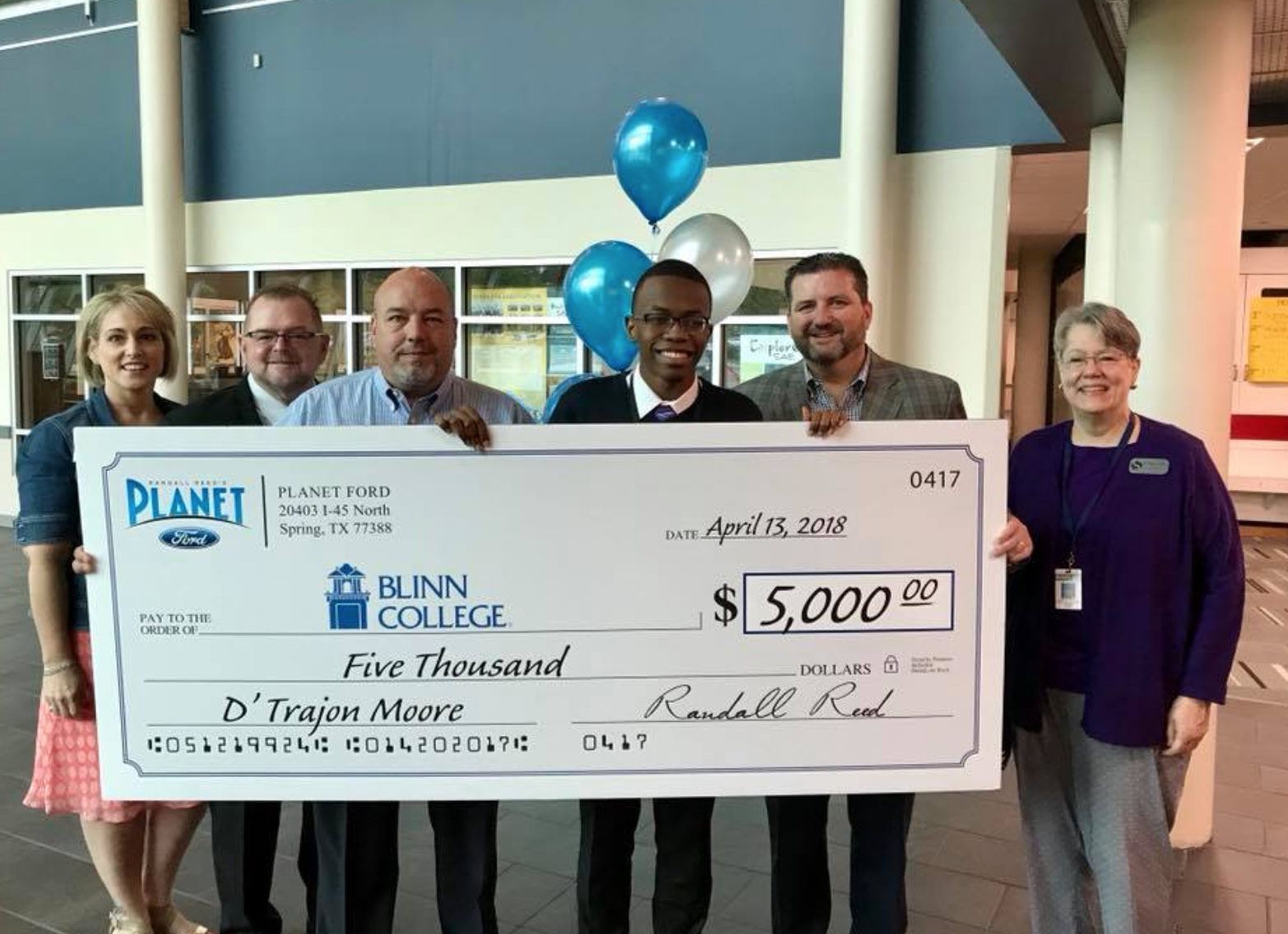 Planet Ford in Spring believes in supporting our kids and their futures. Each year, the Reed family and Planet Ford are proud to work with area schools to identify a special scholarship recipient. This year, our team surprised D’Trajon Moore with a check for $5,000 to use towards college.
