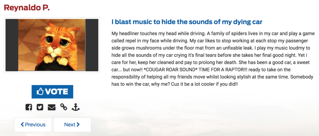 at the site, will be placed into a weekly drawing for a Ford Ambassador Prize Pack. For those who also submit a video or photo entry for the vehicle contest, the contestants are encouraged to share their videos on social media with #PlanetFordWhisperer and #FordWhisperer, and then go tell their friends to vote, like and share! A panel of judges will select the finalists. Here’s a quick glance at a few contestants: