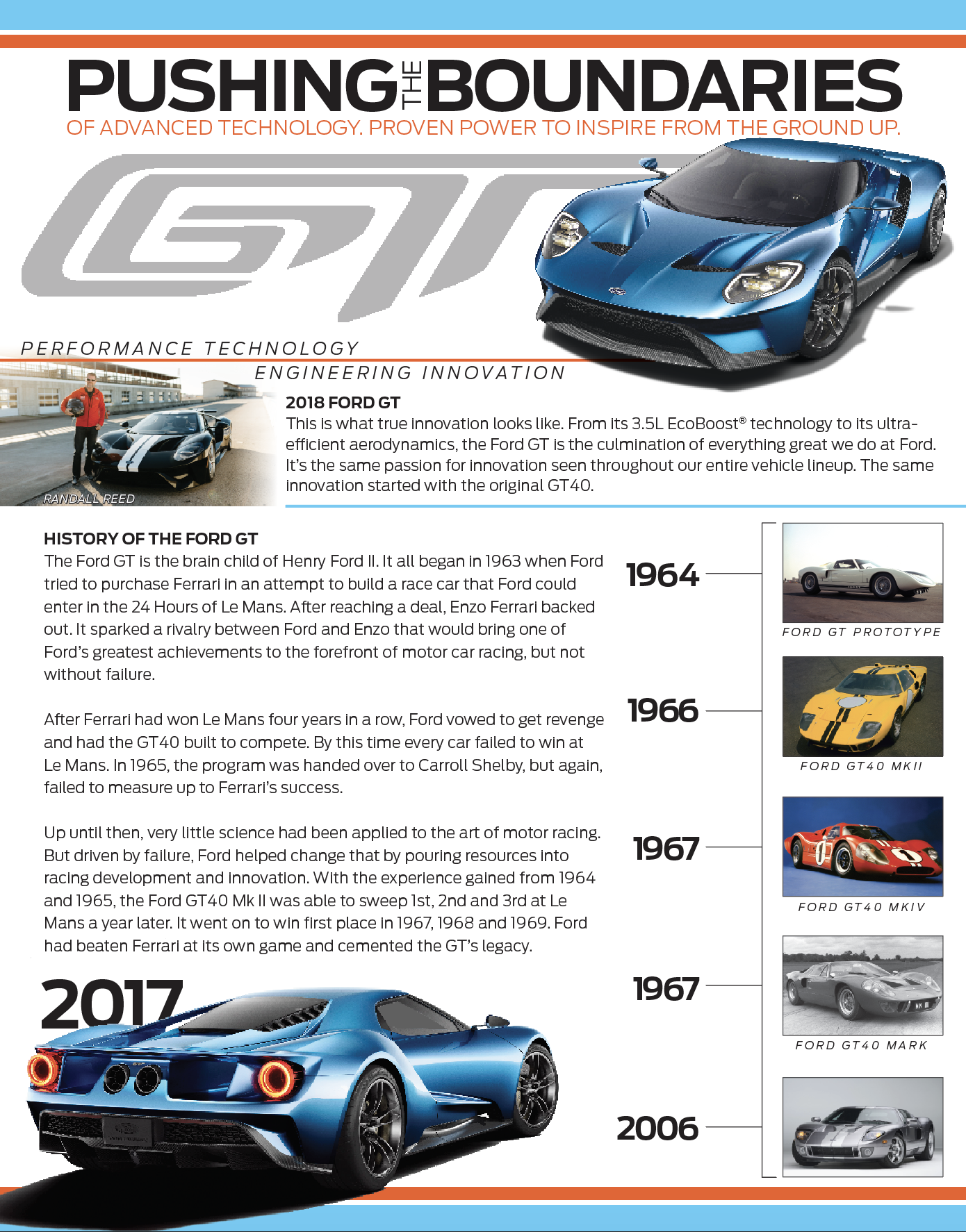 The Ford GT is Ford Motor Company’s Supercar. The GT’s has a carbon-fiber body with a 647-horsepower 3.5L EcoBoost® V6 engine that is technologically designed for aerodynamics.