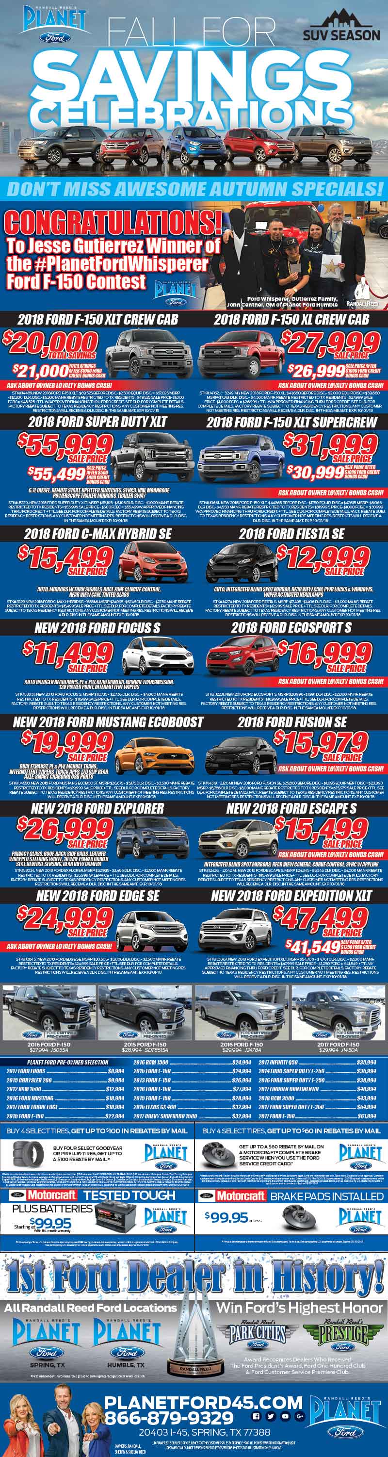 Happy fall from our Planet Ford in Spring on I-45! We are celebrating the season with falling prices. We have awesome deals on Ford F-150s, the Explorer, Edge, Expedition and more!