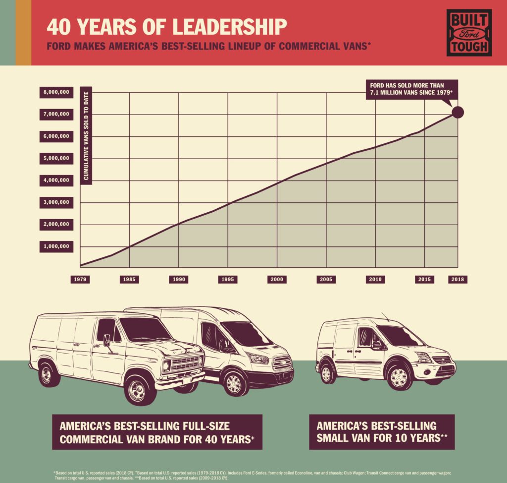 From 1979 through 2018, Ford sold more than 7.1 million vans with powerhouse names like Econoline, E-series, Transit and Transit Connect. Led by Ford Transit, America’s best-selling full-size commercial van, and Ford Transit Connect, the best-selling small cargo van, Ford sold more commercial vans than any other brand last year.